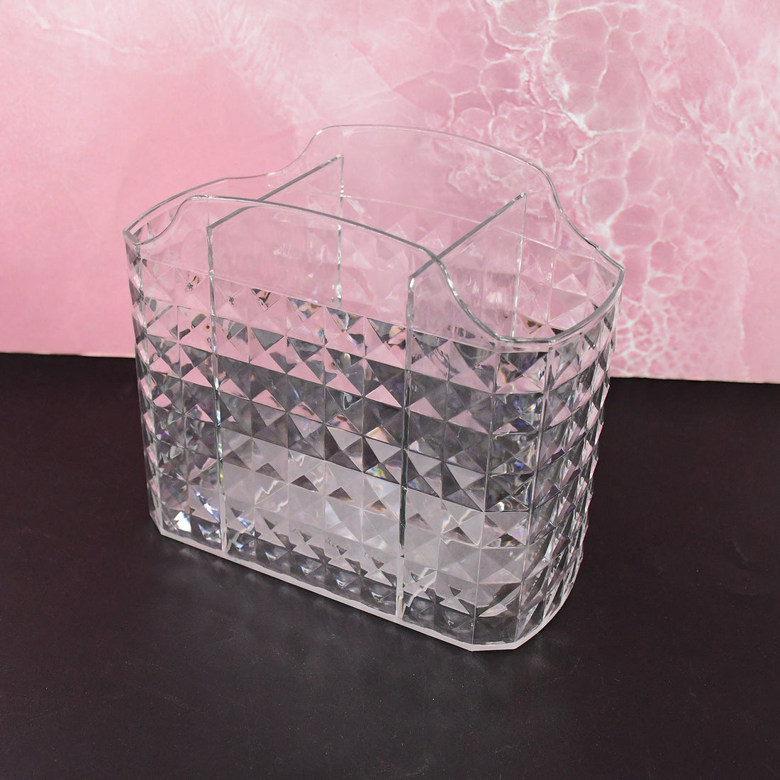 The Crysta Holder is a sleek and functional organizer crafted from durable, unbreakable plastic, designed to bring both style and order to your space. With its elegant crystal-clear body and textured finish, this holder adds a modern touch to any room while allowing you to easily view its contents. Featuring multiple compartments, it?s good for organizing a variety of essentials, including cutlery, makeup brushes, stationery, or toiletries. The lightweight yet sturdy material ensures that the Crysta Holder can withstand daily use in kitchens, bathrooms, or offices. Its compact design helps save space, making it an ideal solution for maintaining a clutter-free environment. Easy to clean, the smooth surface and open-top design allow for simple maintenance, ensuring the holder stays neat and functional for years to come.