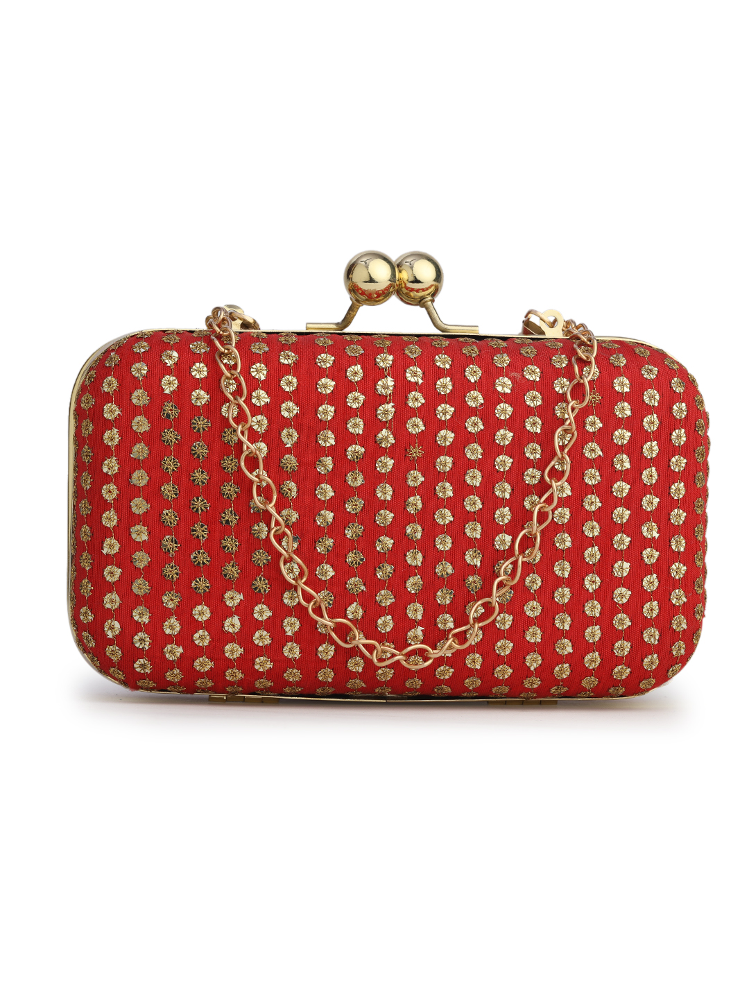 Red & Gold Embroidered Box clutches, Has gold chain shoulder strap, 1 main compartment with Kiss closure