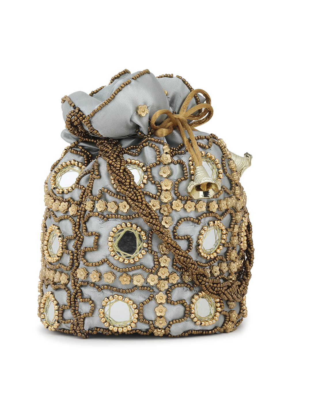 White & Gold-toned embellished potli Has wrist loop 1 main compartment with drawstring closure Size & Fit Size : 9 x 9 x 3 Inch (Length x Width x Depth ) Material & Care Fabric Wipe with clean, dry cloth